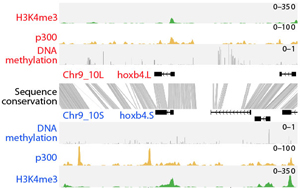 Comparison of the gene-regulatory landscape of the two X.laevis hoxb4 homeologs at an early gastrula stage (Session et al., 2016)