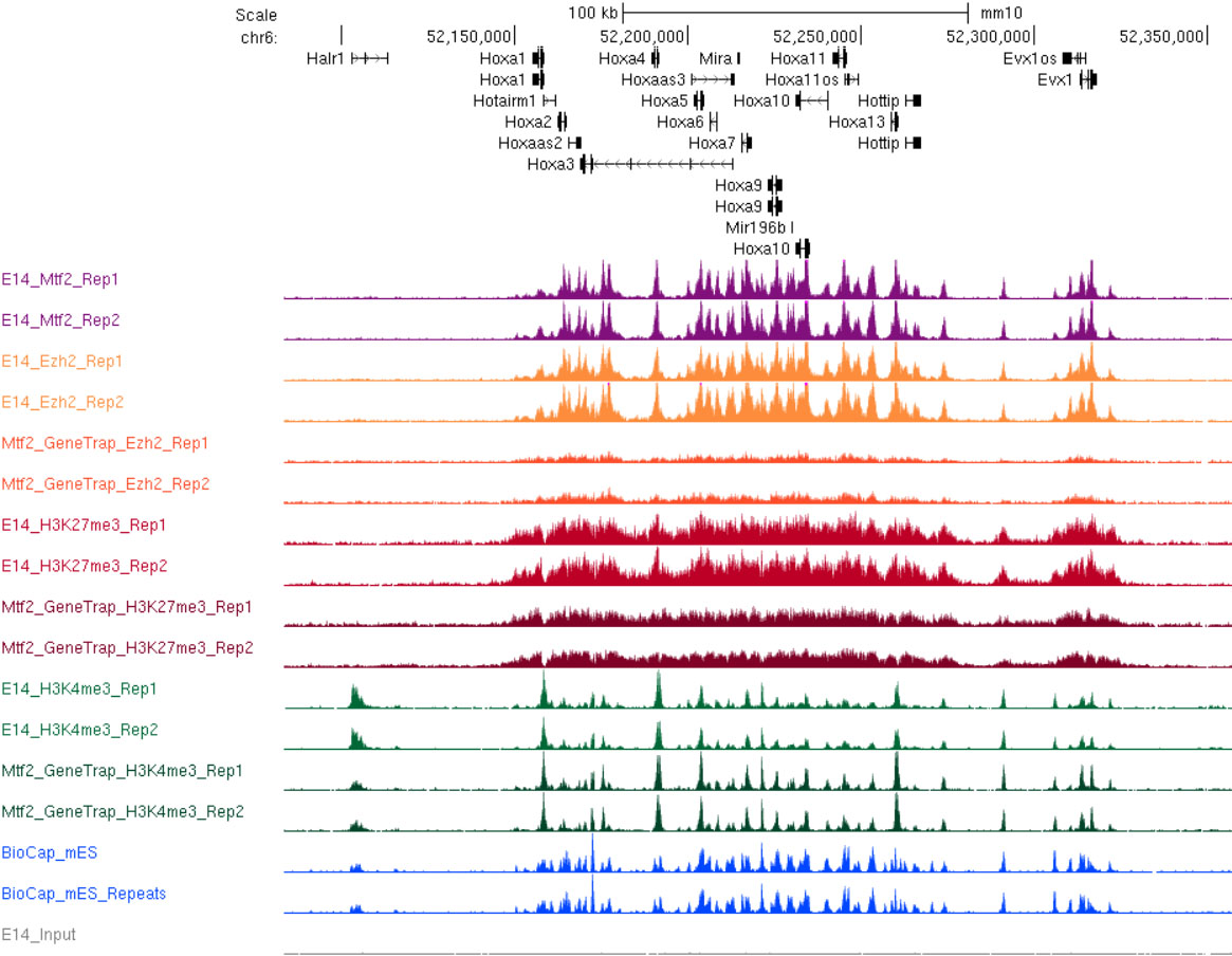 A track data hub has been generated providing access to Veenstra lab chromatin state maps of mouse embryonic stem cells (wild type and mutant lines, treatment with EED inhibitor EED226). The data include ChIP-sequencing tracks of histone modifications (H3K4me3, H3K27me3) and Polycomb Repressive Complex (PRC1 and PRC2) subunits (EZH2, MTF2, JARID2, RNF2).