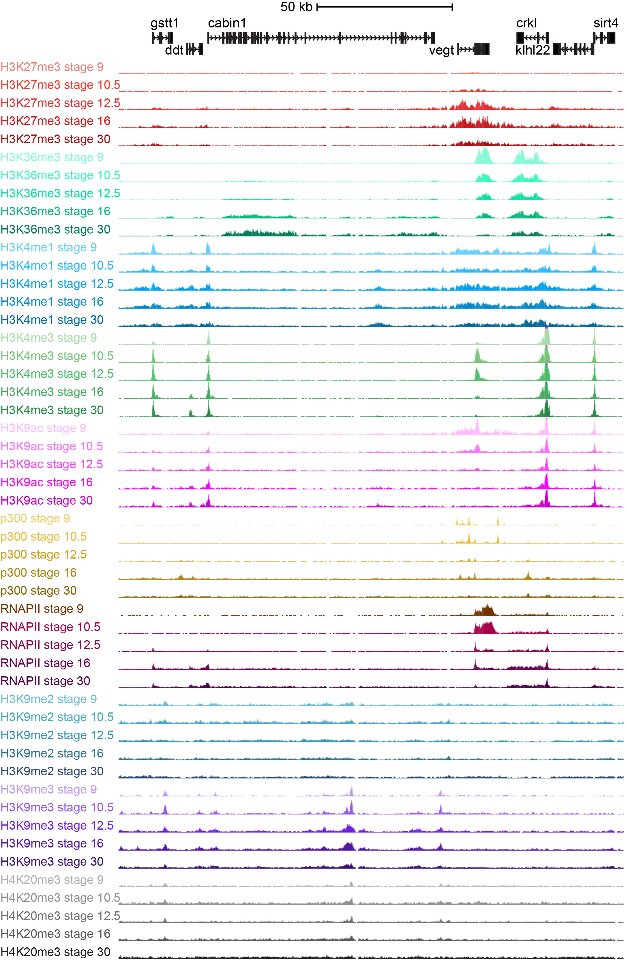A track data hub has been generated providing access to Veenstra lab chromatin state maps, including ChIP-sequencing tracks of eight histone modifications, RNA polymerase II and the enhancer-binding protein p300 during Xenopus tropicalis development from blastula to larval stages.